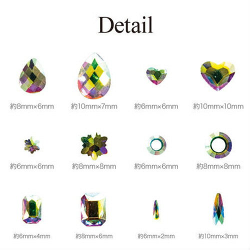 使いやすいサイズのオーロラストーン6種(ドロップ、ハート、サークル、フラワー、レックタングル、シンドロップ)が2サイズ各5個入ったケース入りセットです。
