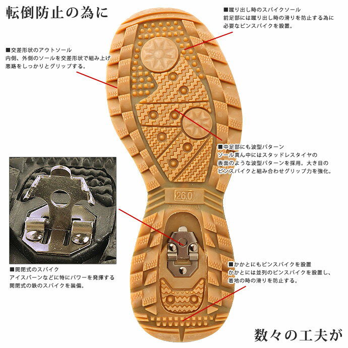 さらに開閉式のスパイクを装備し、凍結路面や硬い雪でも安心!転倒防止の工夫が数多く施されています。
