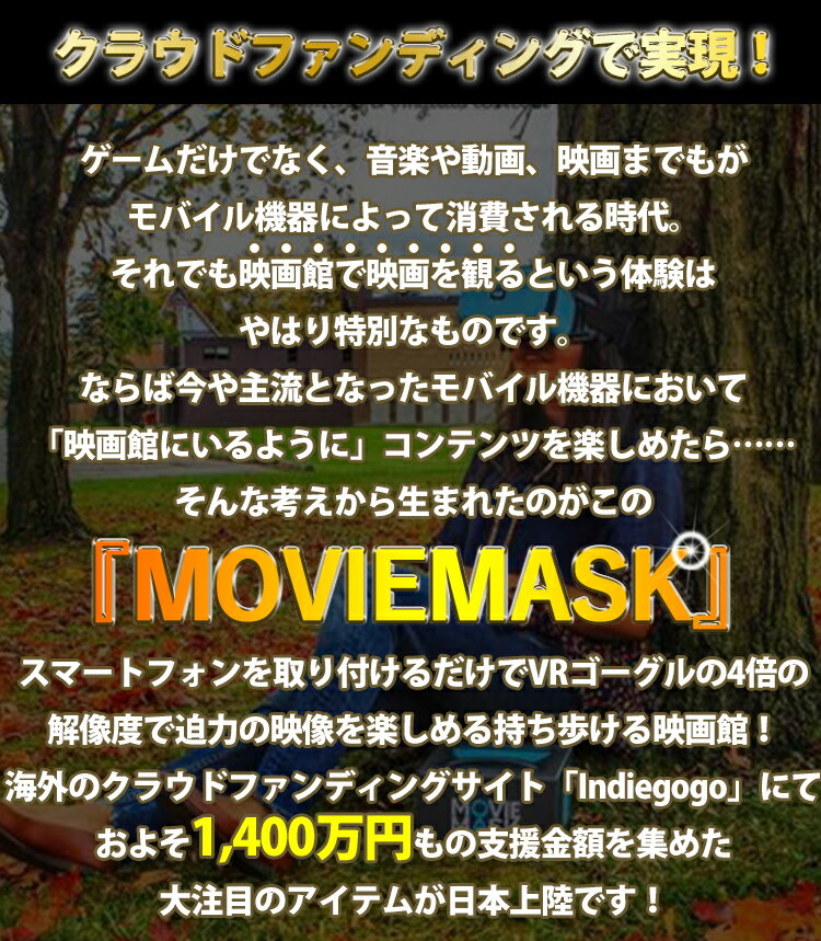 カラーカテゴリー:ブラック/Black/黒/グレー/Gray/灰色/ブルー/Blue/青/スマホをセットするだけ どこでも映画館 ポータブルシネマ ヘッドマウント ゴーグル MovieMask ムービーマスク 【正規品】スマホをセットするだけでどこでも一瞬でプライベート映画館! 海外クラウドファンディングにて実現! 海外のクラウドファンディングサイト「Indiegogo」にて およそ1,400万円もの支援金額を集め実現しました! 映画館を持ち歩く モバイル機器によるコンテンツの消費が当然となる中で、だからこそ特別であり続ける「映画館で映画を観る」という体験。
