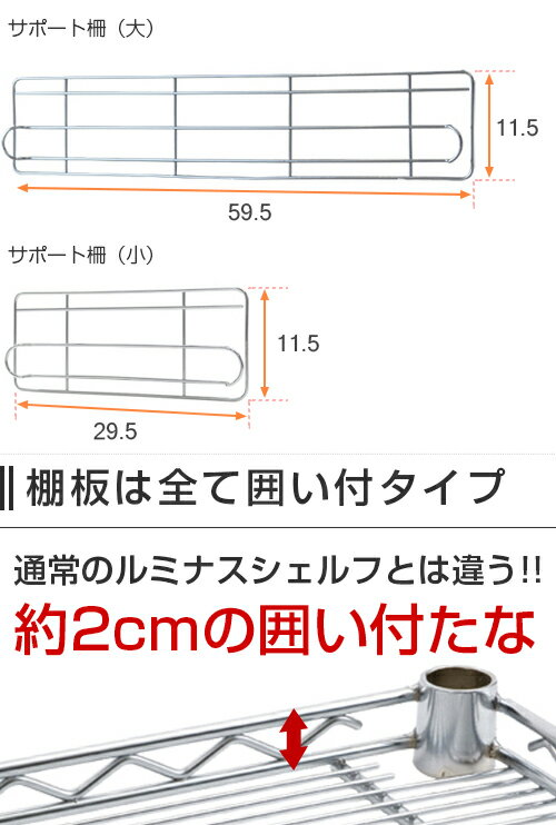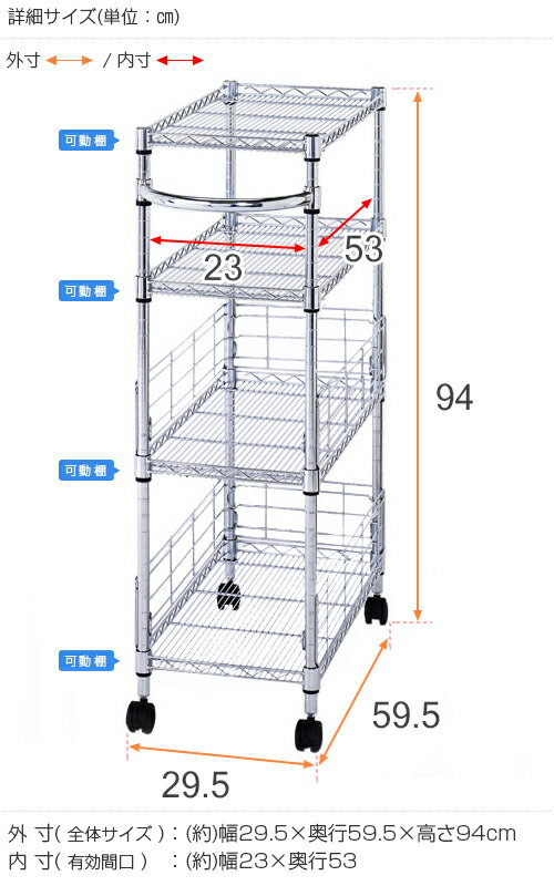 商品シリーズ ルミナスフィール(Luminous Feel) 型番 MD3090-4W アイテムカテゴリ キッチン収納/隙間収納 サイズモデル ポール径 19mm/幅30 奥行60モデル/4段 外形寸法 アジャスタ装着時:(約)幅29.5×奥行59.5×高さ90.5cm キャスター装着時:(約)幅29.5×奥行59.5×高さ94cm 棚板 有効内寸 23×53cm 耐荷重(全体) 300kg 耐荷重(棚板1枚) 80kg 塗装・コーティング クロームメッキ:クリアコーティング(防錆加工) 素材 シェルフ(棚)・ポール:スチール(クロームメッキ)、スリーブ:ABS樹脂 ポール分割 - ポールの溝の数 - セット内容 棚板×4(リバースシェルフ)、ポール×4、標準アジャスター×4、ナイロンキャスター×4(ロック付×2、ロックなし×2)、スリーブ(取付部品)17組、サポート柵×6(大×4、小×2)、ハンドル×1、スパナ×1 梱包サイズ・重量 (約)35×94×30cm/1kg JANコード 4560373440866 アジャスタの仕様 標準アジャスター キャスターの仕様 取り付け時高さ:高さ5.8cm/材質:ナイロン樹脂、スチール(亜鉛メッキ) 備考 ※耐荷重は、スチールシェルフ(棚板)全面に均等に荷重をかけた場合の値になります。